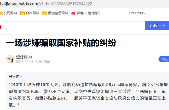 目前,这起涉嫌骗取国家农业补贴的事件仍待进一步调查处理。国家农业补贴是保障农民权益、促进农业发展、稳定粮食安全的重要支撑,任何钻政策空子、侵占国家财政资金的行为,都严重破坏政策公平性与严肃性,必须依法严惩。相关监管部门能否切实履职、回应群众诉求,直接关系政F公信力建设。期待中央巡视组的介入能推动事件公正透明处理,让违法者受惩处、失职者被追责、国家利益得维护,还当事人一个公平正义的结果。